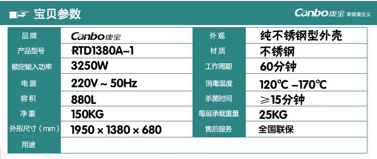 品牌|康宝 外形尺寸(宽×深×高mm)|1950*1380*680mm 保洁方式|高温 储存空间|双门双室 功率(W)|220V-50Hz 3250W 容积(L)|880L 门材质|不锈钢 外壳材质|不锈钢